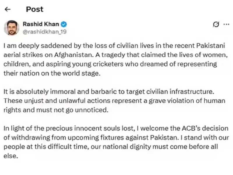राशिद खान ने एक्स पर लिखा, ‘अफगानिस्तान पर हाल ही में हुए पाकिस्तानी हवाई हमलों में नागरिकों की जान जाने से मैं बेहद दुखी हूँ। यह एक ऐसी त्रासदी है जिसमें महिलाओं, बच्चों और उन महत्वाकांक्षी युवा क्रिकेटरों की जान चली गई, जो विश्व मंच पर अपने देश का प्रतिनिधित्व करने का सपना देखते थे।’