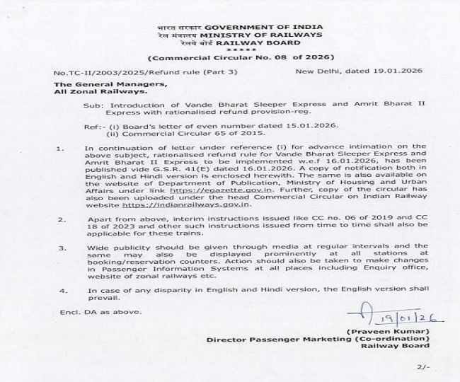 रेलवे ने यह भी साफ किया है कि जनवरी 2026 से शुरू होने वाली सभी अमृत भारत ट्रेनों को अब अमृत भारत-II के नाम से जाना जाएगा और उन पर भी यही नियम लागू होंगे। इस संबंध में 15 जनवरी 2025 को सर्कुलर जारी किया जा चुका है। गौरतलब है कि प्रधानमंत्री नरेंद्र मोदी ने 17 और 18 जनवरी 2026 को वंदे भारत स्लीपर की एक जोड़ी और अमृत भारत-II की नौ जोड़ियों को हरी झंडी दिखाई थी। इन सभी ट्रेनों पर नए कैंसिलेशन नियम तुरंत प्रभाव से लागू हैं।