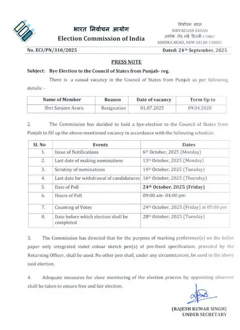 चुनाव आयोग के मुताबिक, चुनाव की अधिसूचना 6 अक्टूबर को जारी होगी। नामांकन दाखिल करने की अंतिम तारीख 13 अक्टूबर, नामांकन पत्रों की जांच 14 अक्टूबर को और उम्मीदवारों की वापसी की अंतिम तिथि 16 अक्टूबर तय की गई है।