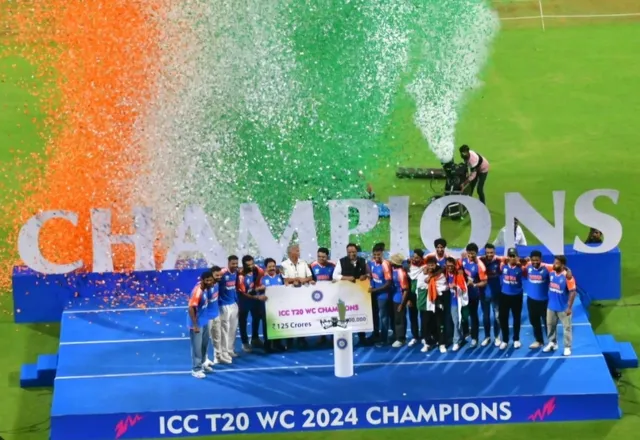 टी20 विश्व कप 2024: बीसीसीआई ने अब तक के सारे रिकॉर्ड तोड़ते हुए इस बार टी20 चैंपियन टीम इंडिया को 125 करोड़ रुपए का इनाम दिया है। वानखेड़े स्टेडियम में गुरुवार को बोर्ड ने टीम को इसका चेक सौंपा दिया है। यह ऐसा आंकड़ा है, जो इनाम के तौर पर आज तक किसी अन्य देश के क्रिकेट बोर्ड ने अपनी विनिंग टीम को नहीं दी है।
