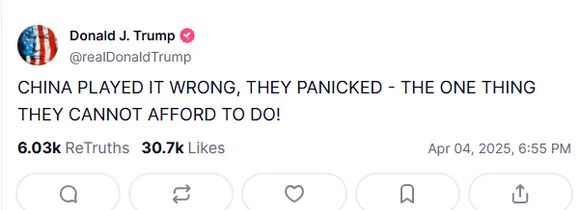 ट्रंप ने शुक्रवार को अपने सोशल मीडिया प्लेटफॉर्म ‘ट्रुथ सोशल’ पर पोस्ट किया, “चीन ने घबराकर गलत कदम उठा लिया और यह एक ऐसी चीज है जो वे कतई बर्दाश्त नहीं कर सकते!”