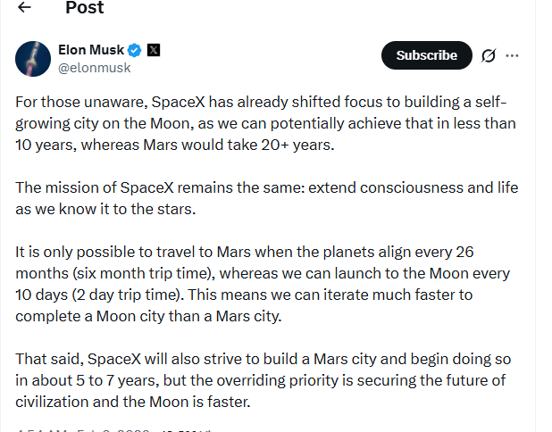 मस्क ने कहा कि यह लक्ष्य 10 साल से भी कम समय में हासिल किया जा सकता है, जबकि मंगल ग्रह पर ऐसा शहर बसाने में 20 साल या उससे अधिक समय लग सकता है। स्पेसएक्स का मूल मिशन आज भी वही है- जैसा हम जीवन और चेतना को जानते हैं, उसे सितारों तक फैलाना।