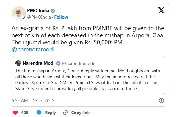 प्रधानमंत्री नरेंद्र मोदी ने हादसे पर शोक व्यक्त किया है। प्रधानमंत्री मोदी ने एक्स पर लिखा, “गोवा के अर्पोरा में हुआ हादसा बेहद दुखद है। जिन परिवारों ने अपने प्रियजन खोए हैं, उनके प्रति मेरी संवेदना है। मैं घायलों के जल्द ठीक होने की कामना करता हूँ। मैंने मुख्यमंत्री डॉ. प्रमोद सावंत से स्थिति की जानकारी ली है। राज्य सरकार प्रभावित लोगों की मदद के लिए हर जरूरी कदम उठा रही है।”