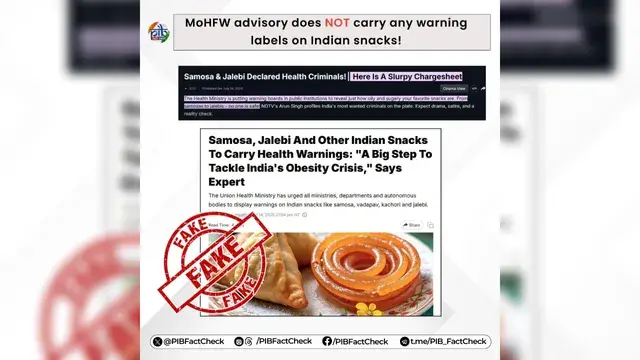 पीआईबी फैक्ट चेक ने इस दावे को झूठा बताया और कहा कि स्वास्थ्य एवं परिवार कल्याण मंत्रालय की सलाह में भारतीय स्नैक्स पर कोई चेतावनी लेबल नहीं है।