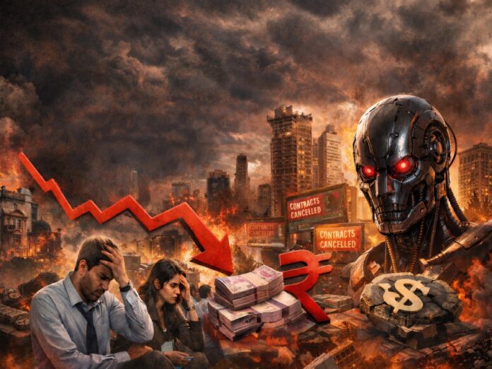 रिपोर्ट के मुताबिक- 2027 के दौरान TCS, Infosys और Wipro में कॉन्ट्रैक्ट तेजी से रद्द होने लगेंगे। भारत के सर्विस सरप्लस के खत्म होने से रुपया चार महीनों में डॉलर के मुकाबले 18 प्रतिशत गिर गया। 2028 की पहली तिमाही तक इंटरनेशनल मॉनेटरी फंड (आईएमएफ) ने नई दिल्ली के साथ ‘प्रारंभिक बातचीत’ शुरू कर दी।