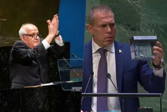 फिलिस्तीन को संयुक्त राष्ट्र (UN) का परमानेंट मेंबर बनाने का प्रस्ताव पास होने के खिलाफ इजराइल के राजदूत गिलाद एर्दान ने सबके सामने आक्रोश में यूएन चार्टर फाड़ दिया। एर्दान ने कहा कि यह दिन संयुक्त राष्ट्र की बदनामी के दिन के तौर पर याद किया जाएगा।