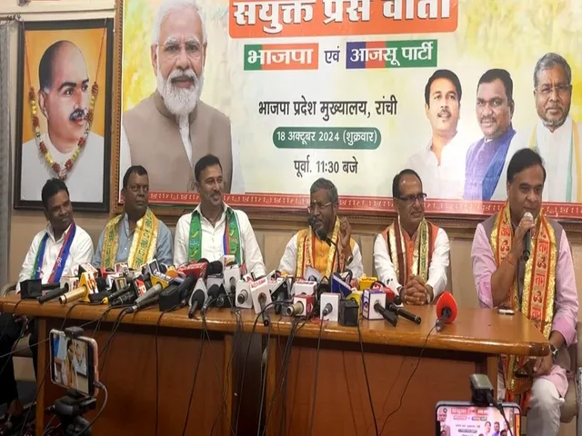 शुक्रवार को रांची के हरमू स्थित झारखंड भाजपा प्रदेश कार्यालय में आयोजित साझा प्रेस कॉन्फ्रेंस में भाजपा और आजसू के नेताओं ने सीट शेयरिंग का ऐलान किया।