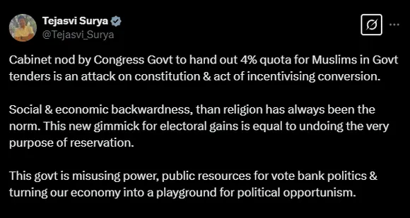 बीजेपी सांसद तेजस्वी सूर्या ने भी इस फैसले की आलोचना करते हुए इसे “धार्मिक रूपांतरण को बढ़ावा देने की रणनीति” बताया। उन्होंने सोशल मीडिया प्लेटफॉर्म ‘एक्स’ पर लिखा, “यह सरकार सत्ता और सार्वजनिक संसाधनों का दुरुपयोग कर रही है। कांग्रेस सरकार वोट बैंक की राजनीति कर रही है और हमारी अर्थव्यवस्था को अपने राजनीतिक स्वार्थों का अखाड़ा बना रही है।”