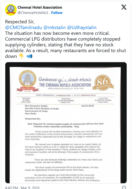 उधर, चेन्नई होटल्स एसोसिएशन ने भी इसी तरह की चिंता जताते हुए कहा कि कई कमर्शियल एलपीजी वितरकों ने स्टॉक खत्म होने की बात कहकर सिलेंडर देना बंद कर दिया है। संगठन ने इस मामले में प्रधानमंत्री नरेंद्र मोदी के हस्तक्षेप की मांग की है।