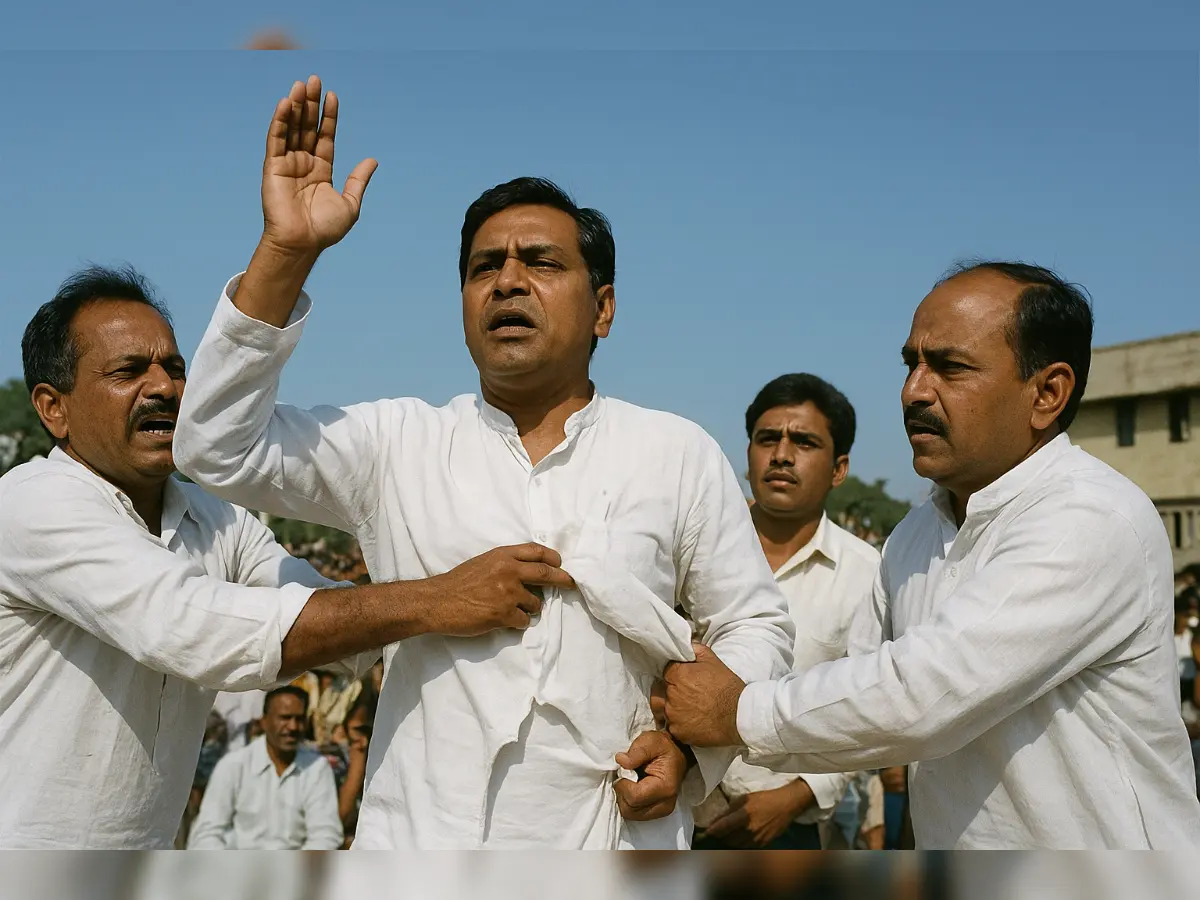 भारतीय जनता पार्टी के तत्कालीन महामंत्री और राज्य प्रभारी नरेंद्र मोदी ने रायपुर के पार्टी कार्यालय में विधायकों की बैठक ली। रायगढ़ के आदिवासी नेता नंदकुमार साय को विपक्ष का नेता घोषित किया गया। रायपुर के विधायक बृजमोहन अग्रवाल, जो मध्य प्रदेश में मंत्री भी थे, विपक्ष के नेता की दौड़ में थे। उनके समर्थक नाराज होकर जिला अध्यक्ष के नेतृत्व में उनके कमरे पर चढ़ गए। नरेंद्र मोदी को चौकी के नीचे छिपना पड़ा और इनका ही कुर्ता फाड़ दिया गया। बाद में पुलिस ने पहुंचकर उन्हें बचाया। इसके बाद पार्टी ने बृजमोहन, जिलाध्यक्ष छगनलाल मुंद्रा और अन्य को निलंबित कर दिया। हालांकि राष्ट्रीय अनुशासन समिति के अध्यक्ष कुशाभाऊ ठाकरे के सुझाव पर 2003 के चुनाव से पहले उन्हें वापस ले लिया गया।
