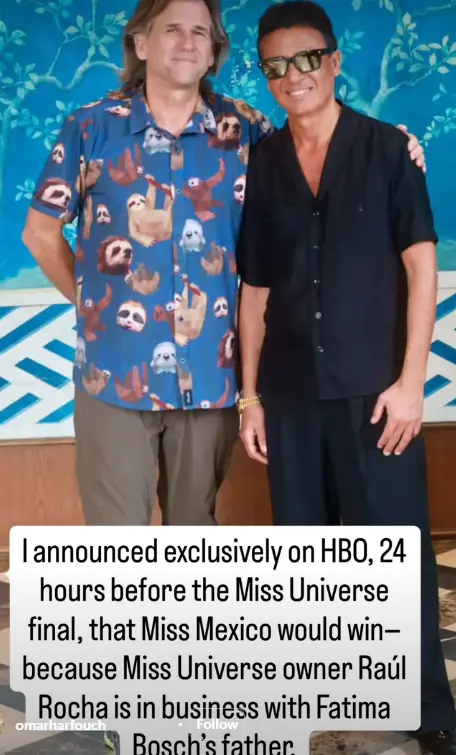 उमर ने आरोप लगाया कि फाइनल से एक दिन पहले ही उन्होंने इस जीत की भविष्यवाणी कर दी थी क्योंकि मिस यूनिवर्स के मालिक राउल रोचा का फातिमा के पिता के साथ व्यापारिक संबंध है। उमर ने दावा किया कि रोचा ने उन्हें फातिमा को वोट देने के लिए व्यक्तिगत रूप से प्रभावित करने की कोशिश की थी, यह कहते हुए कि “यह हमारे कारोबार के लिए अच्छा होगा।”