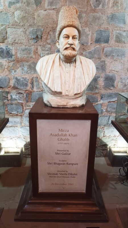 गली कासिम जान की ‘गालिब की हवेली’ में हम रिक्शे से पहुंचे तो शाम के लगभग पौने छह बज गए थे। हवेली मिर्जा गालिब में घुसने से पहले एक तख्त पर लिखा था कि इस हवेली में वर्ष 1860 से 1869 तक गालिब ने अपने जीवन का अंतिम समय व्यतीत किया। हम उनकी हवेली में जैसे ही घुसे तो स्मृतियों में बसे किसी ऐतिहासिक जगह पर आने की खुशी में मन में हलचल और देह में जो सिहरन होती है वही हमारे साथ हो रही थी। हम लोग की रूह लगा जैसे गालिब में फना हो गई। मैंने एक लंबी सांस भरी। भीतर पीली हल्की रोशनी में पत्थर के टुकड़ों और ईंटों से जोड़कर बनाई गई दीवार का एक घर है…घर में प्रवेश करते ही एक छोटी सी गैलरी, जिसमें बाईं ओर ग़ालिब के जीवन के बारे में कुछ अंश लिखित हैं और दाईं ओर एक छोटा कमरा है जिसमें ग़ालिब का बुत है जो गुलज़ार साहब के सौजन्य से है। जिसे बनाया है श्री भगवान रामपुरे ने और जिसका अनावरण 26 दिसंबर 2010 ई. को तत्कालीन मुख्यमंत्री श्रीमती शीला दीक्षित के द्वारा किया गया था। वहीं शीशे में बंद गालिब की हस्तलिखित शायरी की एक किताब है। गैलरी के सामने भी एक बड़ा कमरा है जिसमें कई झरोखे बने हुए हैं। एक झरोखे के भीतर गालिब खुद बैठे हुए लिख रहे हैं। एक दीवार पर ग़ालिब की हुक्का पीते हुए और शायरी लिखती हुई पेंटिंग बनी है। शराब की एक बोतल सामने रखी हुई है। दीवार पर ग़ालिब की पोशाक सुरक्षित रखी हुई है। ग़ालिब की यह हवेली भारतीय पुरातत्त्व सर्वेक्षण के द्वारा संरक्षित रखी गई परन्तु लगा कि यह भी अपनी शायरी में भी शुरूआत में यह अजीम शायर उपेक्षा का दंश झेलता रहा। उसी तरह उनकी इमारत भी उपेक्षित सी लगी।
