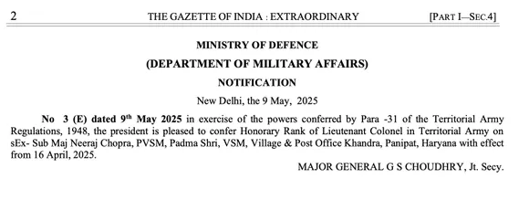 नई दिल्लीः ओलंपिक में भारत को ऐतिहासिक स्वर्ण पदक दिलाने वाले स्टार भालाफेंक एथलीट नीरज चोपड़ा को एक और बड़ी उपलब्धि हासिल हुई है। राष्ट्रपति द्रौपदी मुर्मू ने उन्हें भारतीय सेना की टेरिटोरियल आर्मी में लेफ्टिनेंट कर्नल (मानद) की उपाधि प्रदान की है। यह सम्मान उन्हें भारत की टेरिटोरियल आर्मी रेगुलेशन, 1948 के पैरा-31 के तहत दिया गया है।