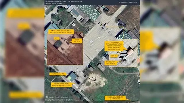 हालांकि, भू-खुफिया विशेषज्ञ डेमियन सायमन ने इन दावों की सैटेलाइट इमेजरी के जरिए पोल खोल दी है। उन्होंने मार्च 2025 की एक सैटेलाइट तस्वीर साझा की जिसमें एक मिग-29 विमान की नियमित मरम्मत चल रही थी। तस्वीर में विमान के पास जो काले निशान दिखाए जा रहे थे, वे दरअसल इंजन परीक्षण के दौरान बने सामान्य कालिख के निशान थे जो दो महीने पहले की गतिविधि थी और किसी भी ‘स्ट्राइक’ का परिणाम नहीं।