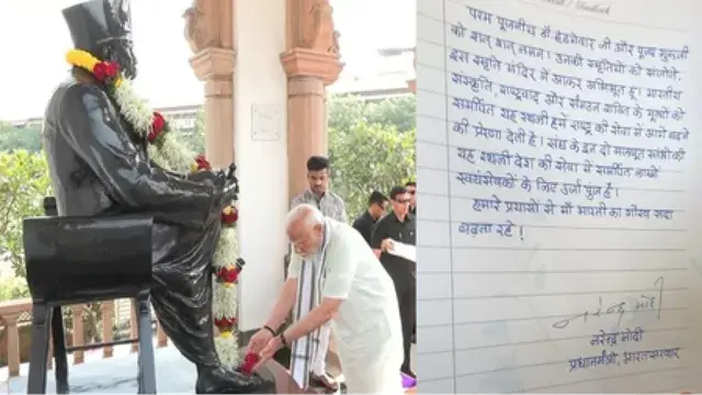 पीएम मोदी ने स्मृति मंदिर में डॉ. हेडगेवार स्मृति मंदिर में राष्ट्रीय स्वयंसेवक संघ (आरएसएस) के संस्थापक केशव बलिराम हेडगेवार और दूसरे सरसंघचालक (प्रमुख) एमएस गोलवलकर को समर्पित स्मारकों पर पुष्पांजलि अर्पित करने के बाद अपने लिखे एक नोट में यह बात कही।