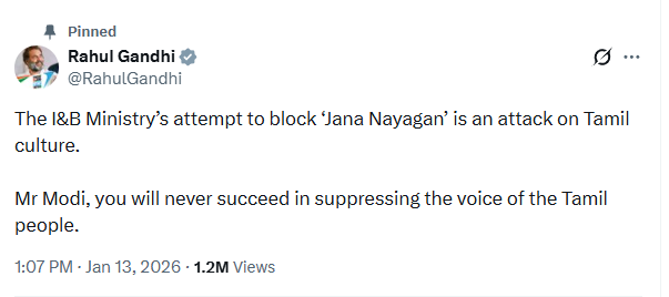 मंगलवार को सोशल मीडिया प्लेटफॉर्म एक्स पर राहुल गांधी ने इस विवाद को ‘तमिल संस्कृति’ पर हमला करार दिया। उन्होंने केंद्र सरकार को चुनौती देते हुए कहा, “सूचना एवं प्रसारण मंत्रालय द्वारा ‘जन नायकन’ को रोकने का प्रयास तमिल संस्कृति पर हमला है। आप (पीएम मोदी) तमिल लोगों की आवाज को दबाने में कभी सफल नहीं होंगे।” कांग्रेस और अन्य विपक्षी दलों का आरोप है कि सरकार नियामक संस्थाओं का उपयोग करके उन राजनीतिक विमर्शों और असहमति की आवाजों को दबा रही है, जो वर्तमान शासन के समानांतर दिखाई देते हैं।