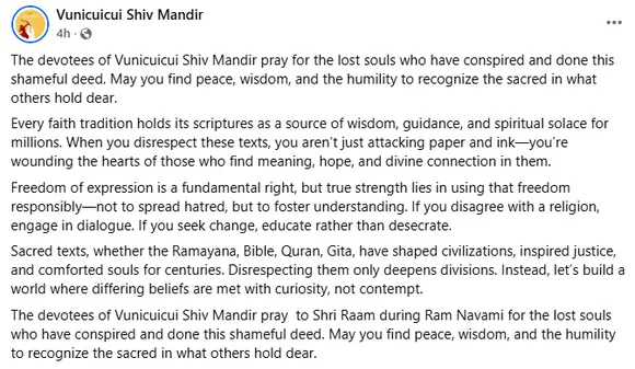 मंदिर समिति ने कहा, “जब किसी धर्म के पवित्र ग्रंथों का अपमान किया जाता है, तो यह सिर्फ कागज और स्याही पर हमला नहीं होता, बल्कि उन लोगों के दिलों को ठेस पहुंचती है जो इनमें आस्था रखते हैं। हमें अपने मतभेदों को समझदारी और सम्मान के साथ हल करना चाहिए।”