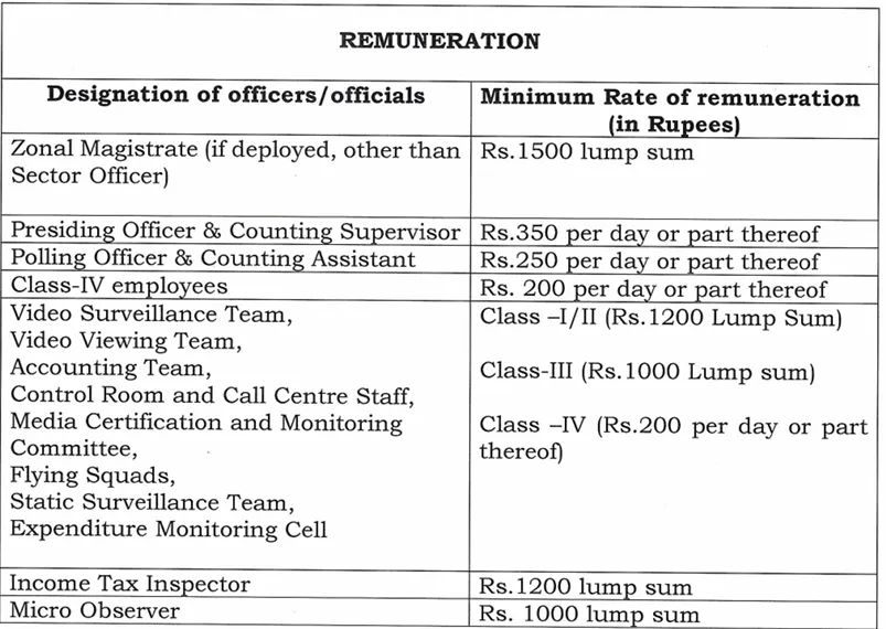 इसके साथ ही पहले और दूसरे दर्जे की वीडियो निगरानी टीम, वीडियो देखने वाली टीम के कर्मचारी को (रु. 1200 एकमुश्त) दिया जाता है। तीसरे दर्ज की लेखा टीम के कर्मचारी को 1000 रुपए एकमुश्त दिया जाता है। वहीं नियंत्रण कक्ष और कॉल सेंटर कर्मचारी, मीडिया प्रमाणन और निगरानी समिति, उड़न दस्ते, स्थैतिक निगरानी दल, व्यय निगरानी कक्ष के कर्मचारियों को 200 रुपए प्रतिदिन मानदेय तय है। जबकि  आयकर निरीक्षक को 1200 रुपए और माइक्रो ऑब्जर्वर को 1000 रुपए एकमुश्त दिए जाते हैं।