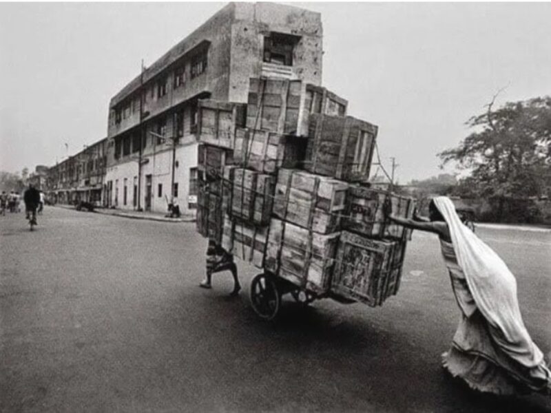 ठेले को धक्का लगाती औरत- विमेन कार्ट पुशर, दिल्ली (1979)- की धनुष-सी तनी काया, हाशिये से निकलकर उठते पाँव और उसके हाथ की मुद्रा देखकर किसी बहुमंज़िली इमारत की बराबरी करते बोझ और उसे धकेलने के लिए ज़रूरी ताक़त के साथ ही उसकी मेहनत की अहमियत का अंदाज़ भी होता है। फ़्रेम में स्त्री को जिस जगह रखा गया है, वह रघु राय के ‘दुनिया से सारगर्भित संवाद के क्षण’ की नज़ीर बन जाता है। श्रम की गरिमा को रेखांकित करती यह तस्वीर देखने वालों को अपने आसपास की दुनिया को देखने की नई निगाह, नया नज़रिया ज़रूर देती है।