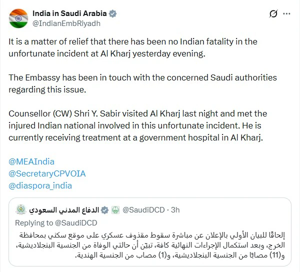 भारतीय दूतावास ने सोशल मीडिया मंच एक्स पर कहा कि “अल-खर्ज में रविवार शाम हुई दुर्भाग्यपूर्ण घटना में किसी भारतीय नागरिक की मौत नहीं हुई, यह राहत की बात है।” दूतावास ने यह भी बताया कि वह इस मामले में सऊदी अधिकारियों के संपर्क में है और स्थिति पर नजर रखे हुए है।