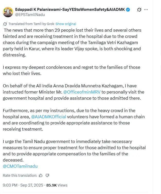 तमिलनाडु विधानसभा में नेता प्रतिपक्ष और एआईएडीएमके (AIADMK) महासचिव एडप्पाडी के. पलानीस्वामी ने अभिनेता से नेता बने विजय की करूर रैली में हुई भगदड़ पर गहरा दुख और सदमा जताया है। उन्होंने देर शाम कहा कि यह खबर बेहद पीड़ादायक है कि इस हादसे में 29 से ज्यादा लोगों की मौत हो गई और कई लोग बेहोश होकर अस्पताल में इलाज करा रहे हैं।
