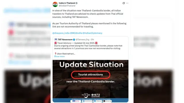 भारतीय दूतावास ने एक्स पर पोस्ट करते हुए कहा, “थाईलैंड-कंबोडिया सीमा के पास स्थिति को देखते हुए, थाईलैंड में मौजूद सभी भारतीय नागरिकों और यात्रियों को सलाह दी जाती है कि वे यात्रा से पहले थाईलैंड के आधिकारिक स्रोतों, विशेषकर TAT न्यूजरूम से अपडेट लें।”