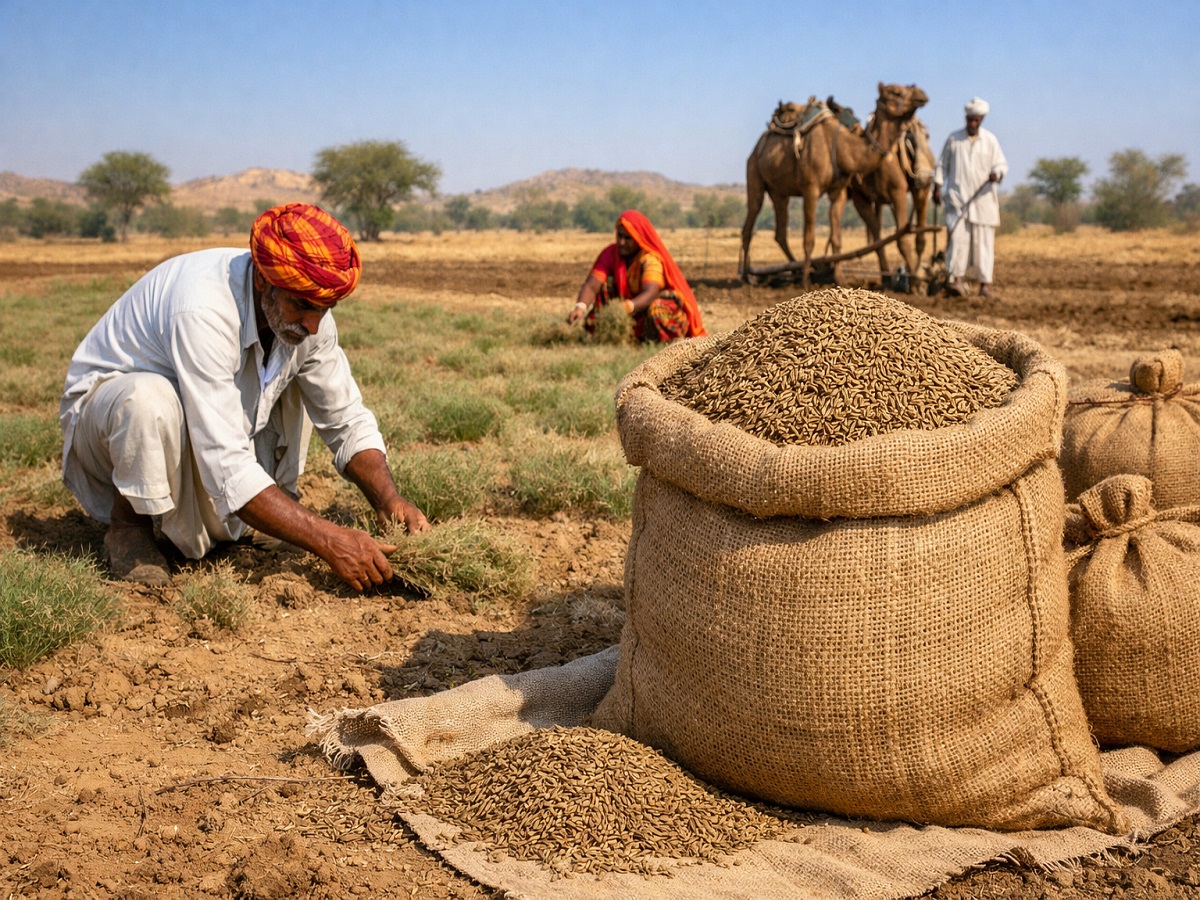 जीरे की खेती पर बात जारी रखते हुए बा ने आगे कहा, ”आज स्थिति यह है कि बाड़मेर, जालोर, जैसलमेर और जोधपुर में करीब 5.5 लाख हेक्टेयर में जीरे की बुवाई होती है। भारत में जीरे का 99% उत्पादन राजस्थान और इससे लगते गुजरात से आता है। साथ ही भारत दुनिया का 70% जीरा पैदा करता है। राजस्थान अकेले लगभग 3 लाख टन प्रति वर्ष जीरा पैदा करता है। इन सब बड़े बड़े आंकड़ों के बाद भी हकीकत यह है कि जीरा एक जुए जैसा है। फसल बोरी में डालकर अपने गोदाम में जब तक रख नहीं ली, तब तक कोई भरोसा नहीं है। इतनी जोखम भरी खेती और कोई नहीं है। अब इस बार भी देख लो, इतना अच्छा जीरा हुआ था, पर कल रात आए तूफान ने सब साफ कर दिया। ईसबगोल तो पूरा ही खराब है, जीरे में भी नुकसान ही है।”