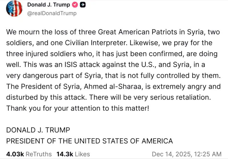 राष्ट्रपति ट्रंप ने ट्रुथ सोशल पर लिखा कि यह हमला सीरिया के उस बेहद अस्थिर हिस्से में हुआ, जो पूरी तरह दमिश्क सरकार के नियंत्रण में नहीं है। उन्होंने कहा कि सीरियाई राष्ट्रपति अहमद अल-शरा इस घटना से बेहद गुस्से में और परेशान हैं और जवाब बहुत गंभीर होगा। बाद में व्हाइट हाउस में पत्रकारों से बात करते हुए ट्रंप ने कहा कि सीरियाई बल अमेरिकी सैनिकों के साथ मिलकर आईएसआईएस के खिलाफ लड़ रहे हैं।