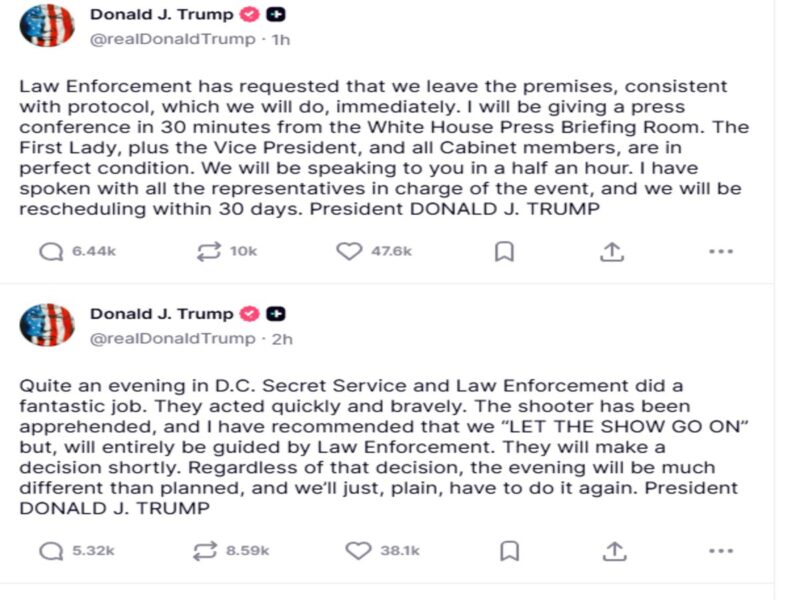 5. घटना के बाद, ट्रंप ने सोशल मीडिया पर एक अपडेट शेयर किया, जिसमें उन्होंने कन्फर्म किया कि स्थिति कंट्रोल में आ गई है और सिक्योरिटी एजेंसियों के तुरंत प्रतिक्रिया की तारीफ की। उन्होंने बताया कि संदिग्ध को पकड़ लिया गया है और इवेंट को जारी रखने के बारे में कोई भी फैसला लॉ एनफोर्समेंट अथॉरिटीज करेंगी। बाद में व्हाइट हाउस में प्रेस कॉन्फ्रेंस के दौरान ट्रंप ने कहा कि एक व्यक्ति कई हथियारों के साथ सुरक्षा चेकपॉइंट की ओर बढ़ा था। उन्होंने कहा कि यह बेहद अप्रत्याशित घटना थी, लेकिन सीक्रेट सर्विस और पुलिस ने बहुत तेजी और साहस के साथ उसे रोक लिया।