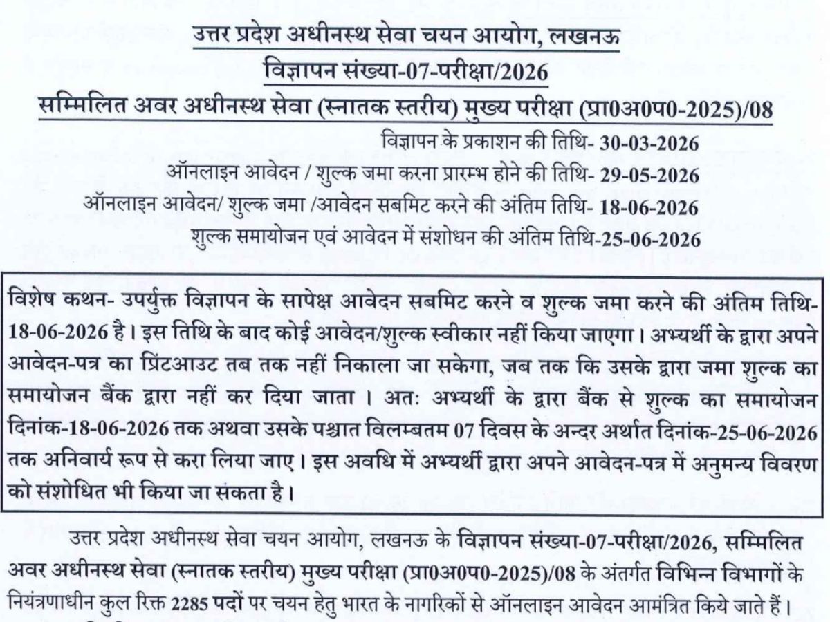 Uttar Pradesh Subordinate Service Selection Commission (UPSSSC): उत्तर प्रदेश में चुनावी साल से पहले छात्रों के लिए बड़ी खुशखबरी है। उत्तर प्रदेश अधीनस्थ सेवा चयन आयोग (UPSSSC) ने लोअर पीसीएस पदों के लिए बंपर भर्ती निकाली है। इसके लिए कुल 2,285 पदों पर भर्ती की जाएगी।