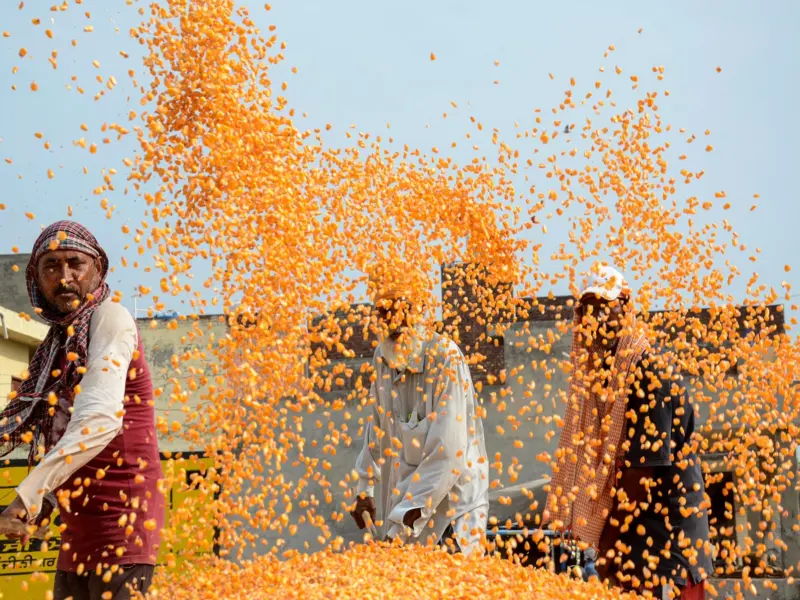 Amritsar: Workers spread maize to dry under the sun at a grain market, in Amritsar on Tuesday, July 04, 2023. (Photo:IANS/Pawan Sharma)