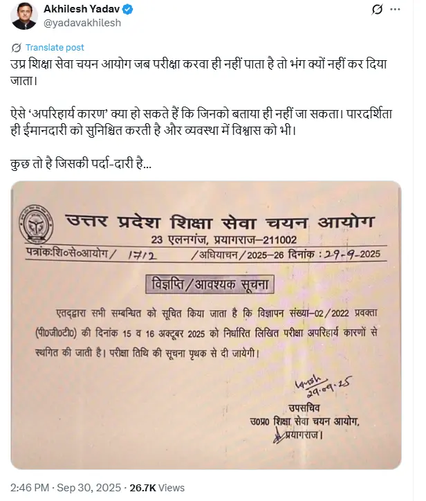 15 और 16 अक्टूबर 2025 को होने वाले UP PGT 2025 परीक्षा एक बार स्थगित कर दी गई है। समाजवादी पार्टी के प्रमुख अखिलेश यादव ने इसको लेकर राज्य सरकार पर निशाना साधा है। उन्होंने एक्स पर सीधे तौर पर कहा कि अगर उत्तर प्रदेश शिक्षा सेवा चयन आयोग परीक्षा नहीं करा पा रहा है तो इसे भंग क्यों नहीं कर दिया जाता।