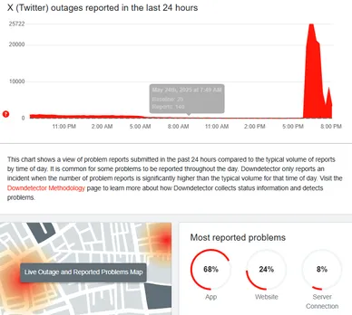 भारत में एक्स के डाउन होने पर कुल 2,151 यूजर्स ने शनिवार शाम 6:18 बजे सबसे ज्यादा शिकायतें दर्ज कीं। इनमें से 45% यूजर्स को लॉगिन करने में दिक्कत हुई, 39% को ऐप में समस्या का सामना करना पड़ा, जबकि 16% यूजर्स को वेबसाइट से जुड़ी परेशानी हुई। हालांकि कुछ समय बाद यह तकनीकी समस्या खुद ही समाप्त हो गई।